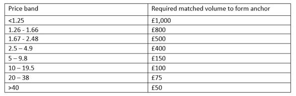 - Implementation of the update_anchor_prices routine [tradingroutines.py file]. Seems like it will be enough to hold the latest version of each RunnerBook [Order Book for a runner] in memory & compare the traded runner volume between version N & version (N+1). Whenever it crosses the required volume for the given odds range (i.e. traded selection volume at time N is below the Betfair threshold, volume at (N+1) above), the anchor price has been determined. Add the selectionId & the anchor price as a key-value pair & return the updated dictionary.